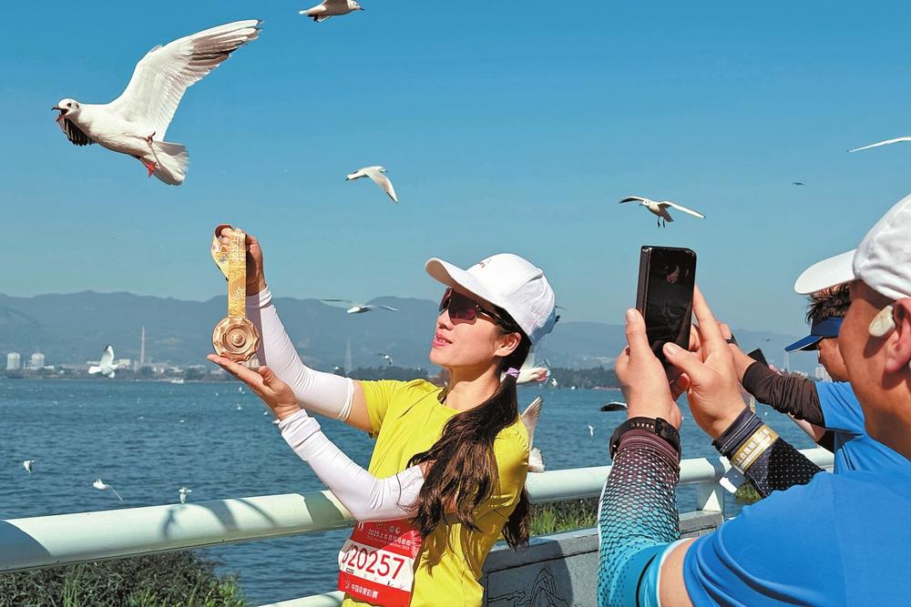 参赛选手完赛后在滇池畔与红嘴鸥合影留念。云南日报记者 高吴双 摄